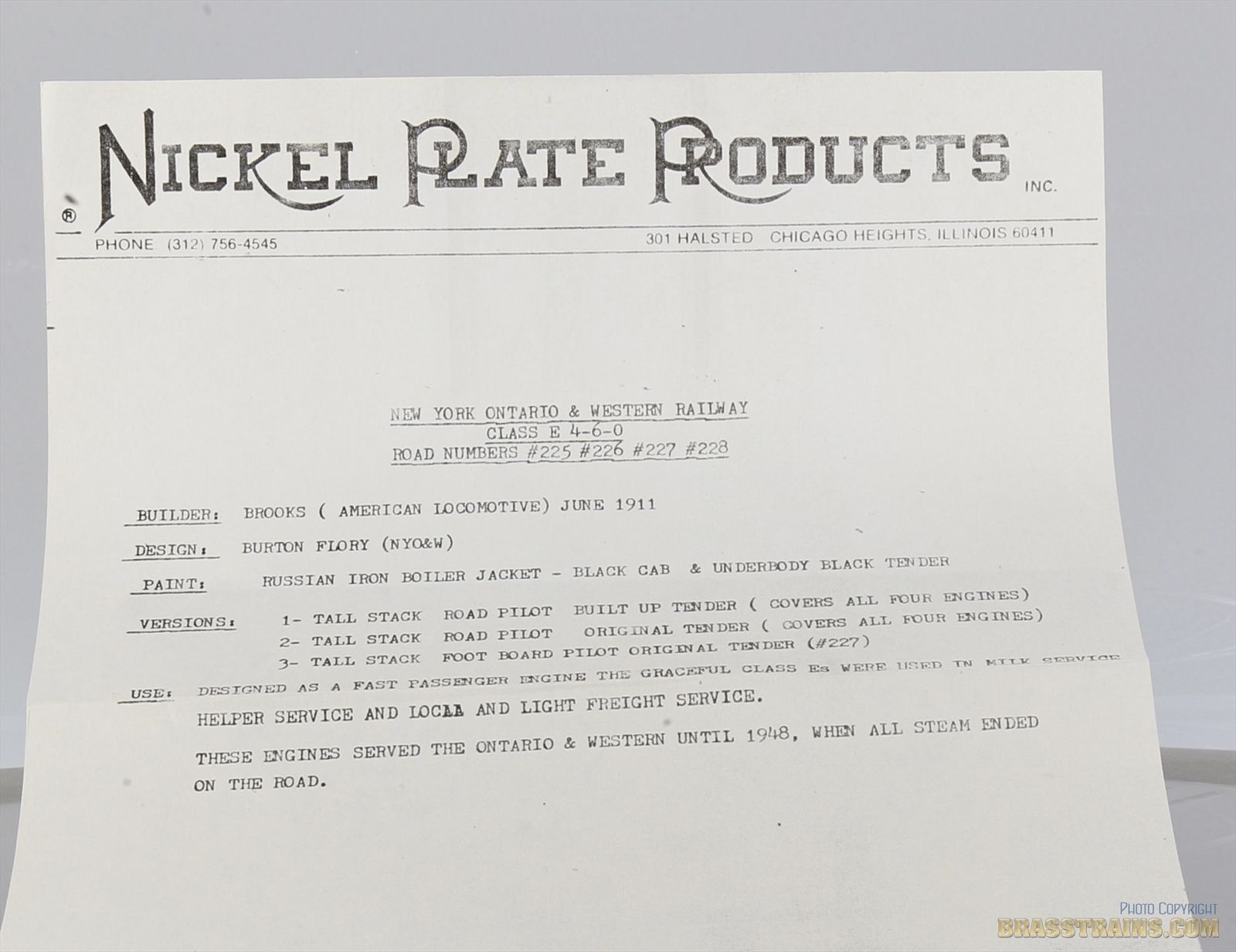 According to NKP's Info: Designed as a fast passenger engine, the graceful Class E's were used in Milk Service, Helper Service, and Local & Light Freight Service. These engines served the O&W until 1948 when all steam was ended on the road.