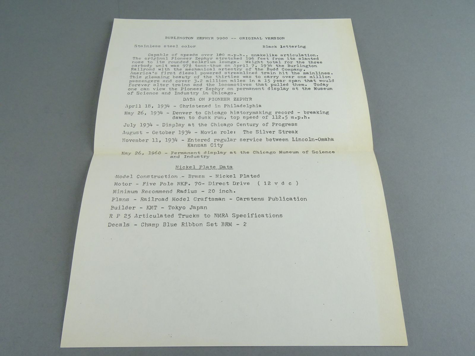 HO Brass Model - NPP CB&Q Burlington Zephyr Set - F/Plated - 3 Units - One is Powered