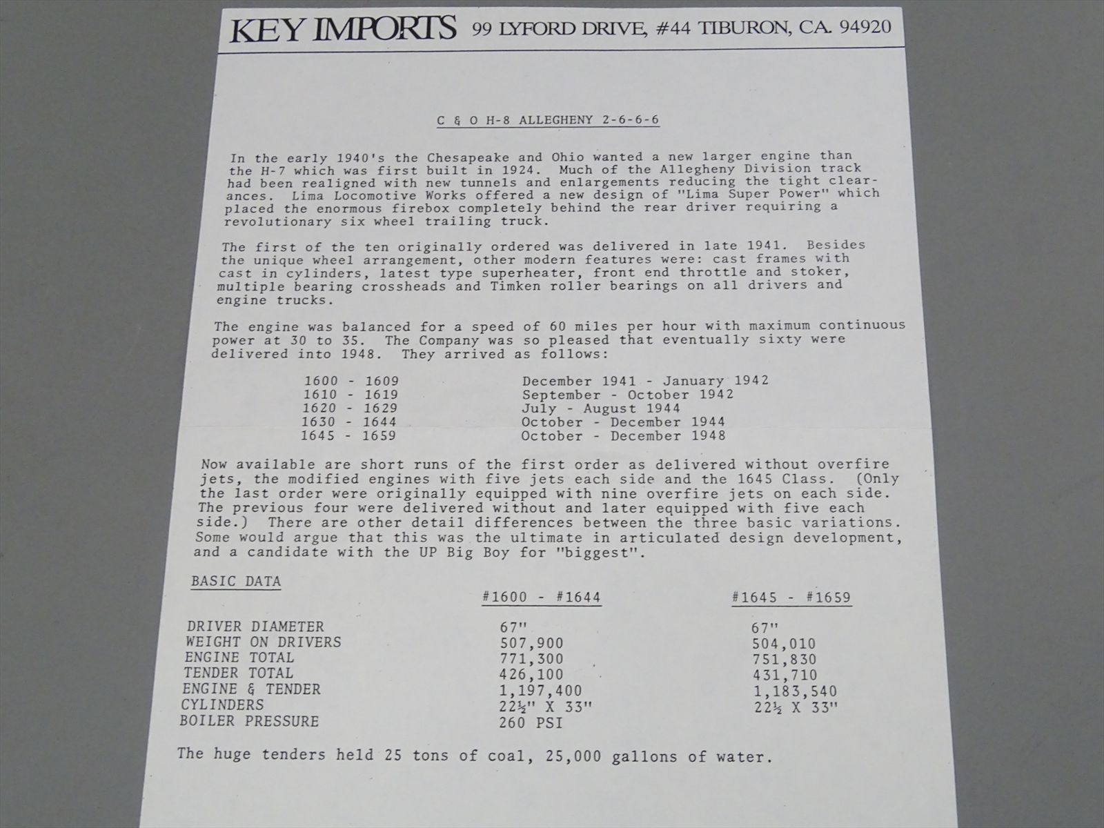HO Brass Model - Key CS#46 C&O Chesapeake & Ohio H-8 2-6-6-6 Allegheny #1645 Late - F/P - 1986 Run - Samhongsa