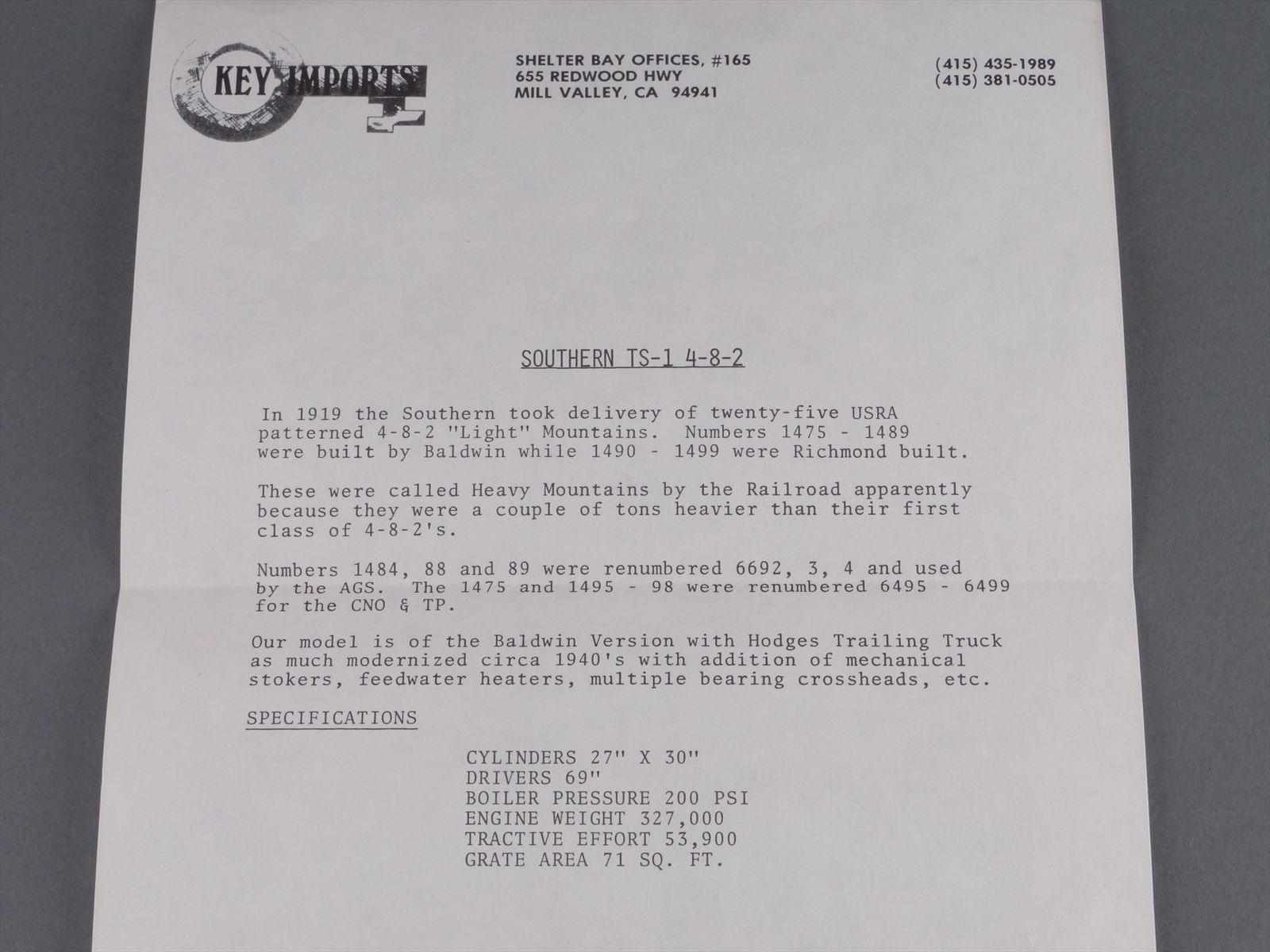 HO Brass Model Train - Key Imports Samhongsa Southern TS-1 4-8-2 CUSTOM #1489