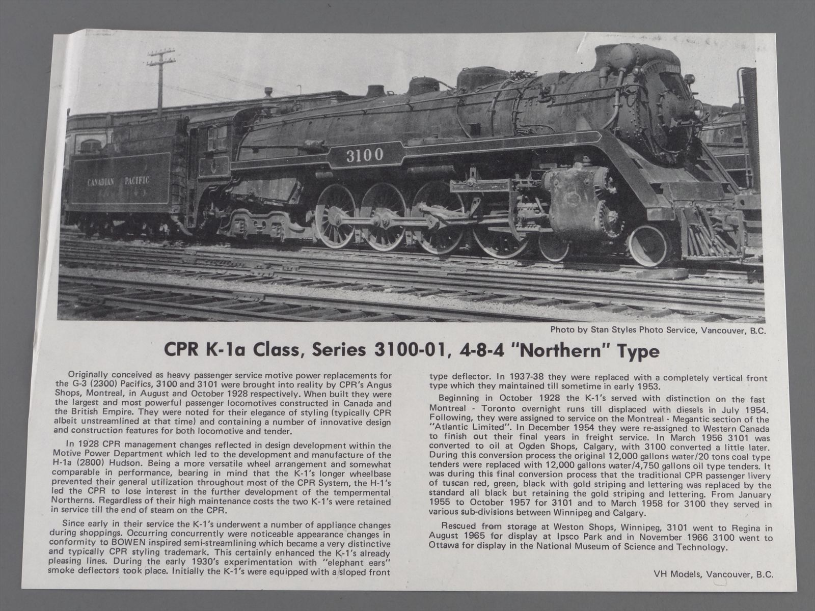 HO Brass Model Train - PFM VH CP Canadian Pacific 4-8-4 K-1a #3101 - Custom
