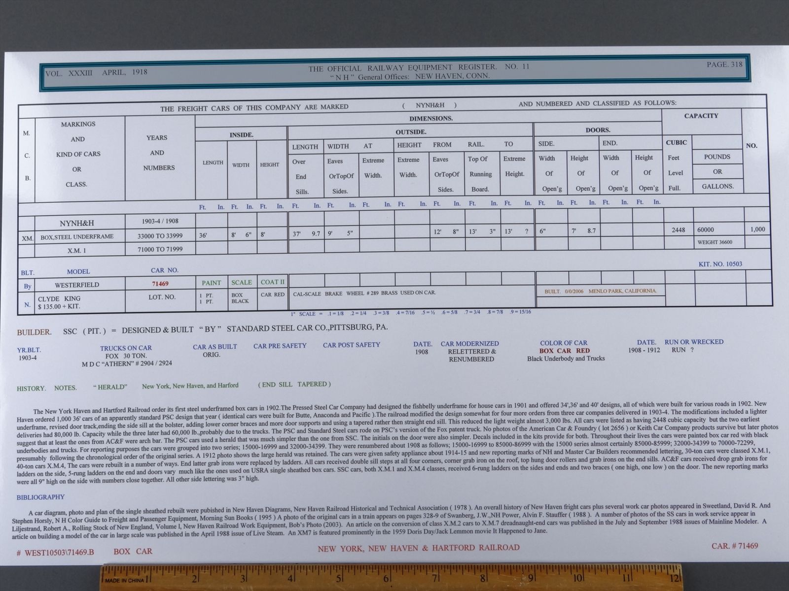HO Westerfield 10503 Pro Built Kit - NH New Haven Fishbelly Box Car #71469 - Custom