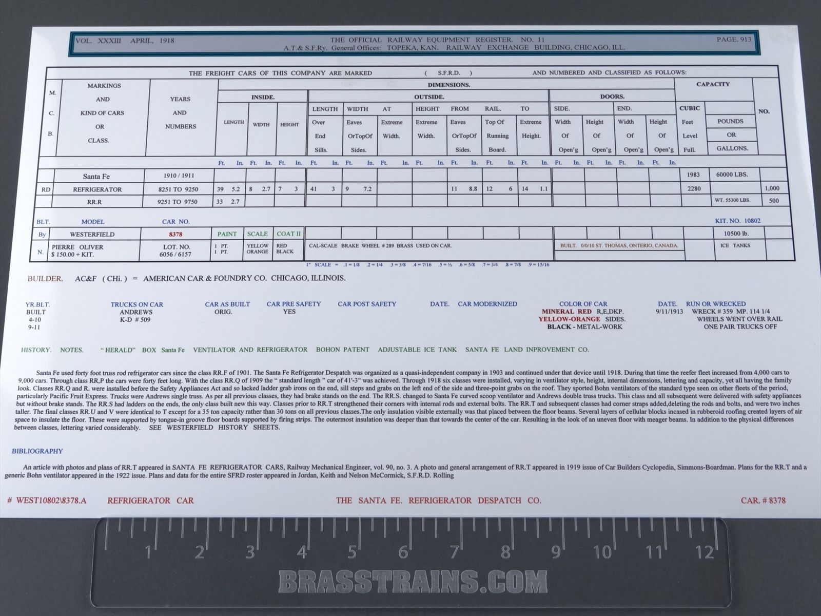 HO Westerfield 10802 Pro Built Kit - SFRD Santa Fe Reefer Refrigerator Car #8378 - Custom
