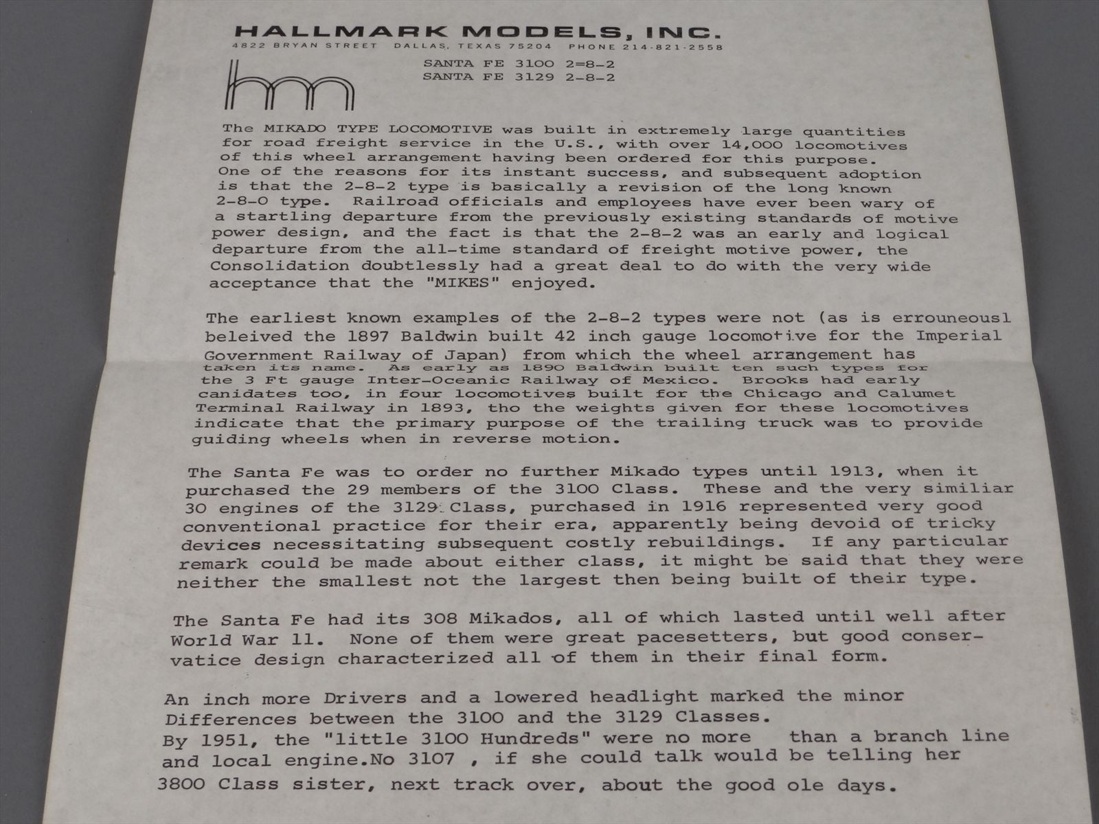 HO Brass Model Train - Hallmark Models ATSF Santa Fe 2-8-2 3129 Class