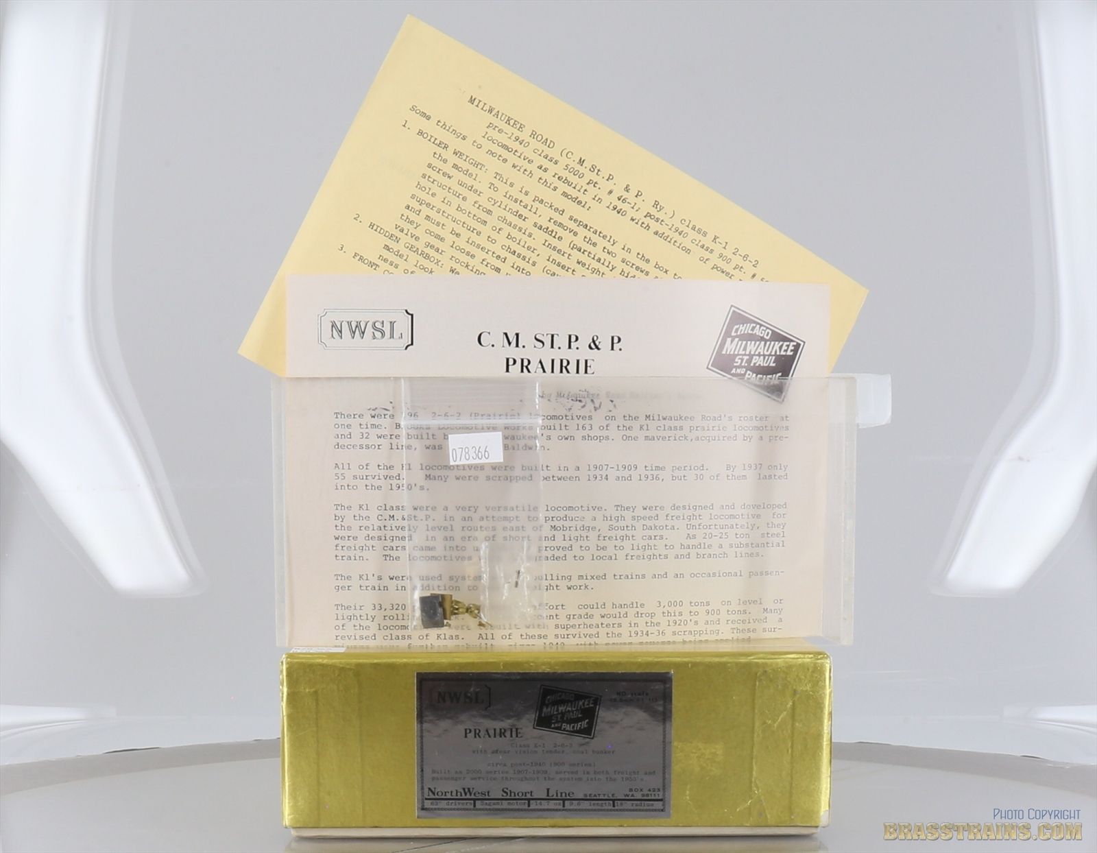 | Notes: | UNPAINTED - 900 CLASS - POST 1940 VERSION - MR REVIEW 6/77 - CLEAR VISION TENDER - COAL BUNKER - ORIGINALLY BUILT AS 2000 SERIES 1907 - 1909 - SERVED IN BOTH FREIGHT AND PASSENGER SERVICE THROUGHOUT THE SYSTEM INTO THE 1950'S - 63" DRIVERS - SAGAMI CAN MOTOR - 9.6" LONG - 14.7 OZ - 18" RADIUS - CHICAGO MILWAUKEE ST PAUL & PACIFIC CMSTP&P |