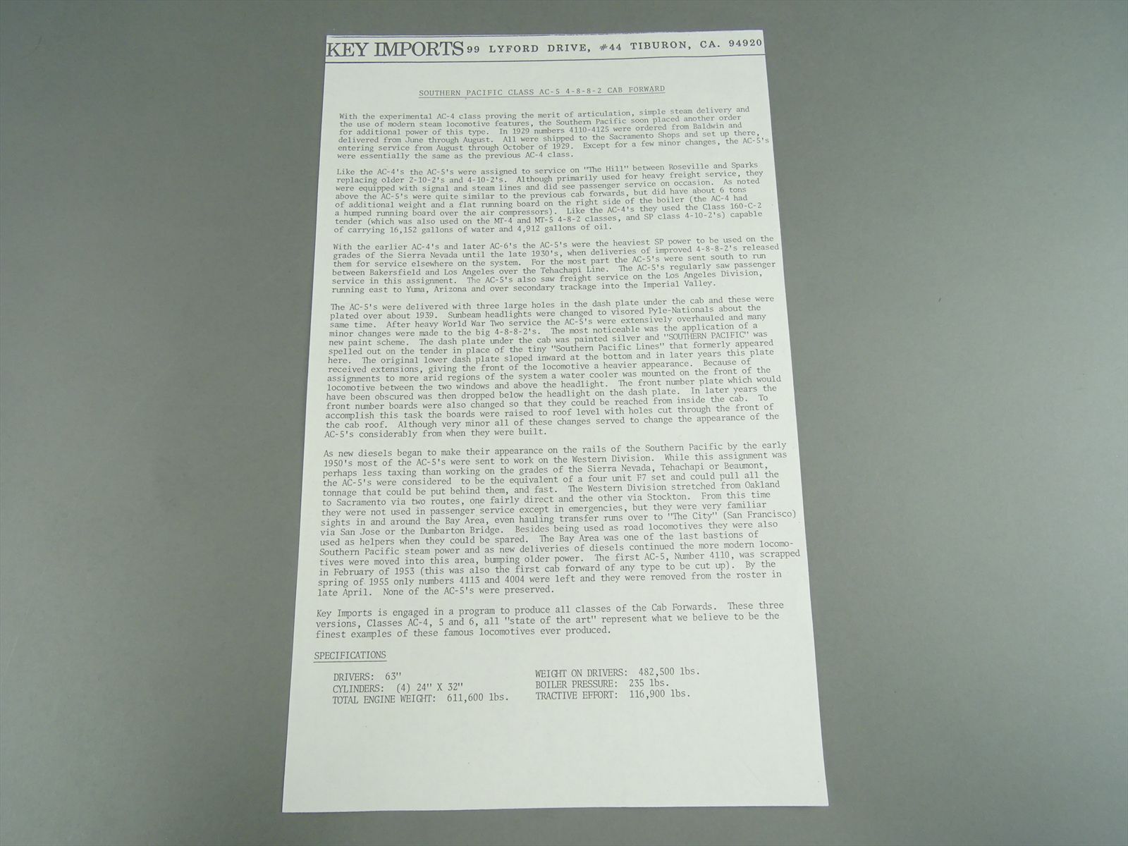 HO Brass Model - Key CS#21 SP Southern Pacific AC-5 Cab Forward #4110 - F/P