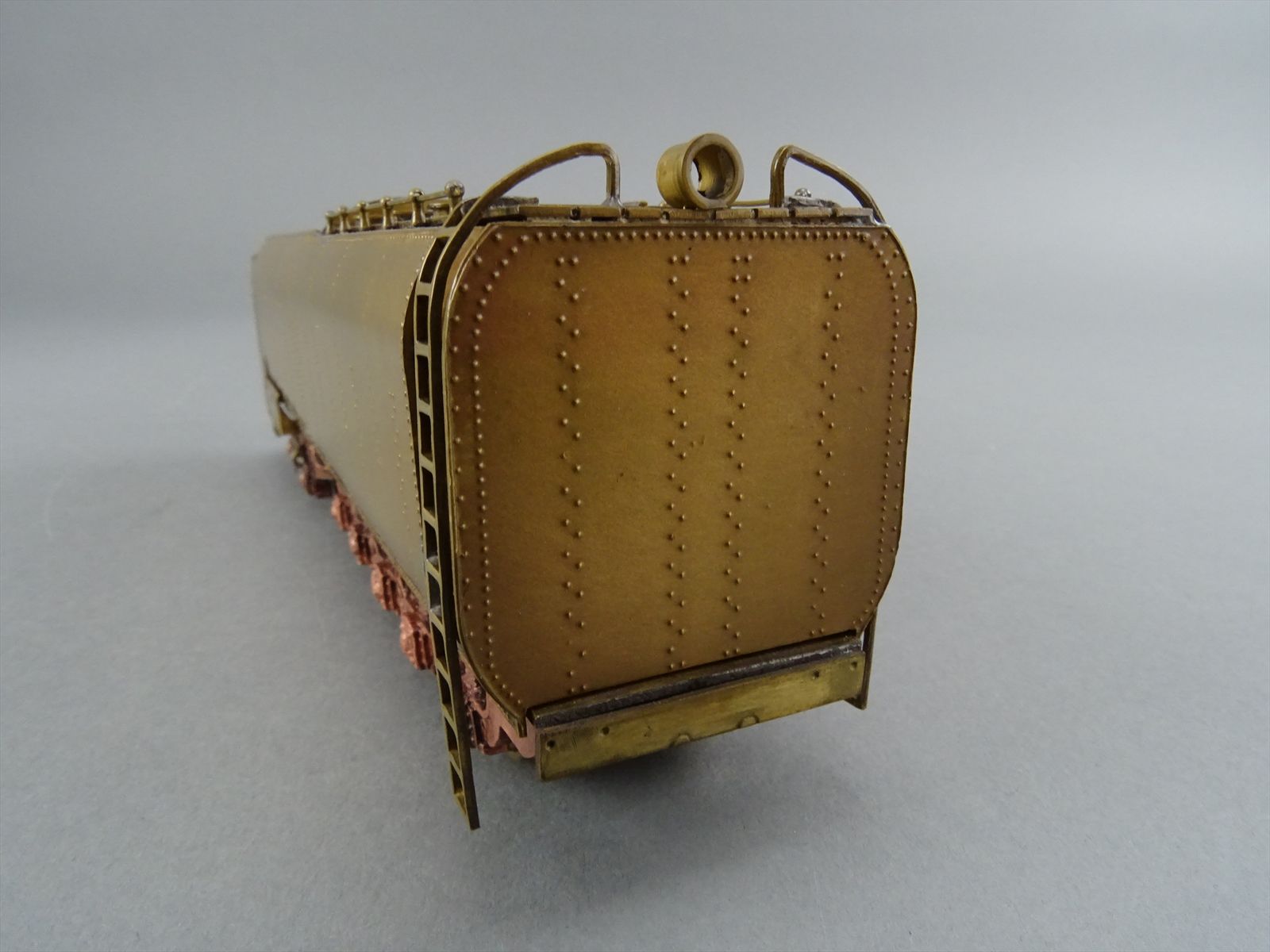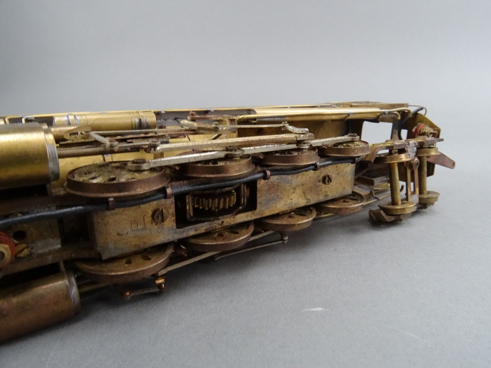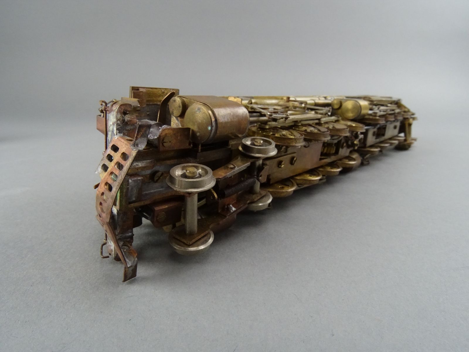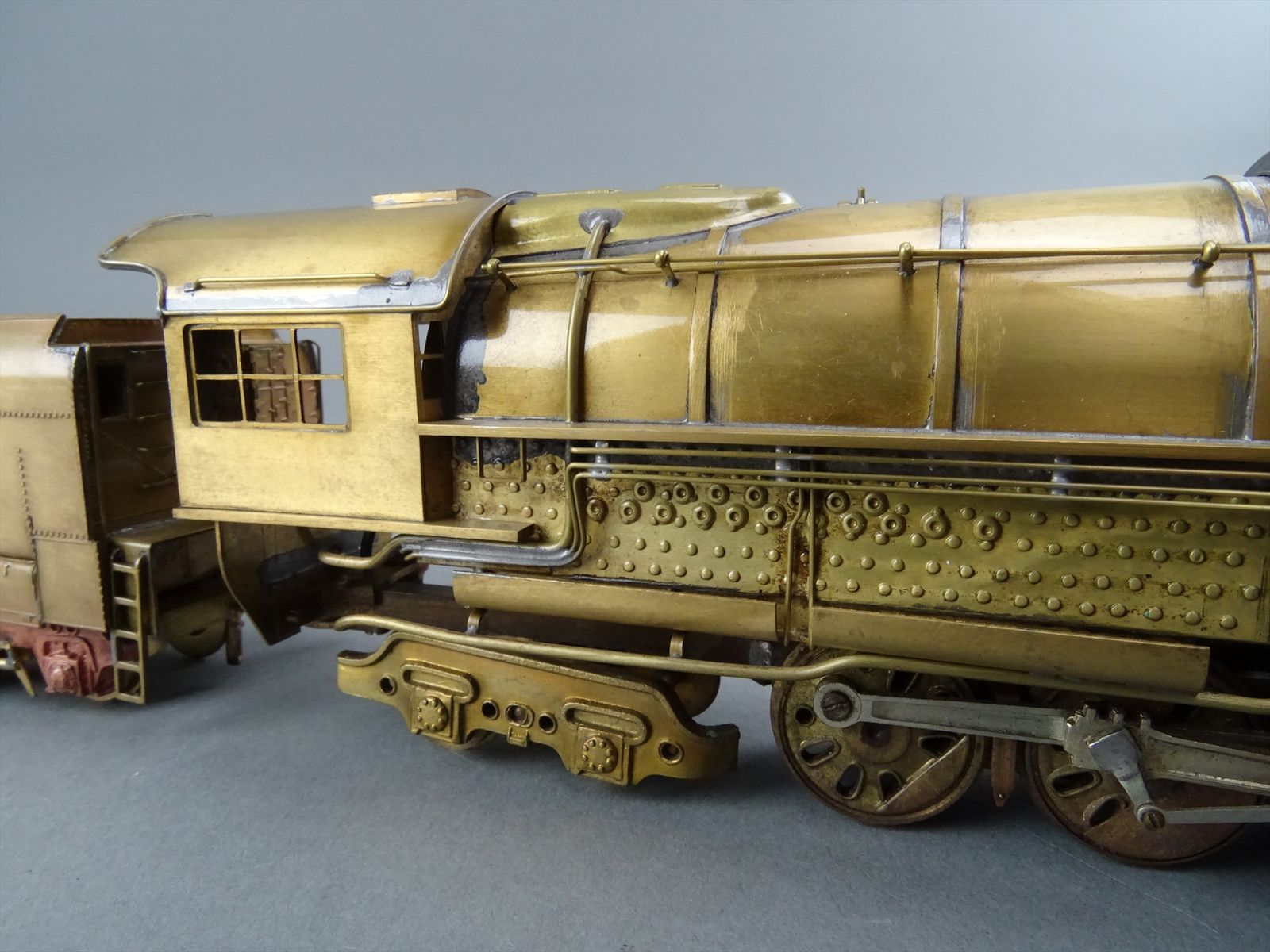 These early models were built entirely from photographs. Yet most were scaled quite accurately, albeit lacking the "fine scale detailing" which today's modelers have come to expect. Notice this Big Boy has only two hatch covers atop the Big Boy's sand domes. This was because the builder only had SIDE VIEW photos to work from! How could he have known the hatch covers were in pairs. Also the tender truck pedestal side-frames are 'hollowed out' and made of copper. The builder would make a single side frame pattern. This would be pressed into a substance like our modeling clay which was then painted with an electrically conductive paint, placed in a plating tank, and plated with copper. Thus the nicely detailed replica of the original was made, some time before the 'Lost Wax' process began to be employed. Later hand built Big Boys did not use this process.Every axle on both the loco and tender is sprung. A lot of extra handwork for sure, and process that did not last long because of all the work. Steel dies were created which allowed some of the parts to be 'coined'. However, because of the prohibitively expensive cost of the dies, they were used only for parts that could be used on many models. This model has coined driver centers, but only one style. Added to those are hand filed counterweights.