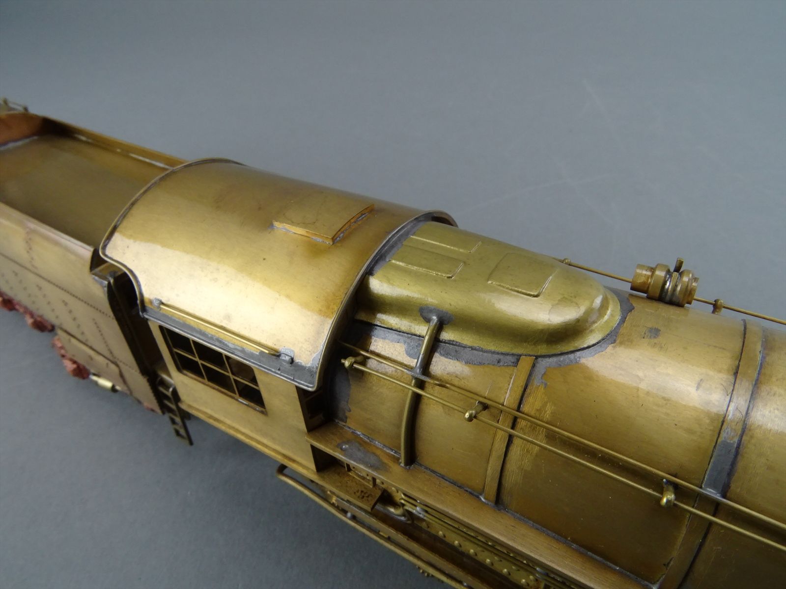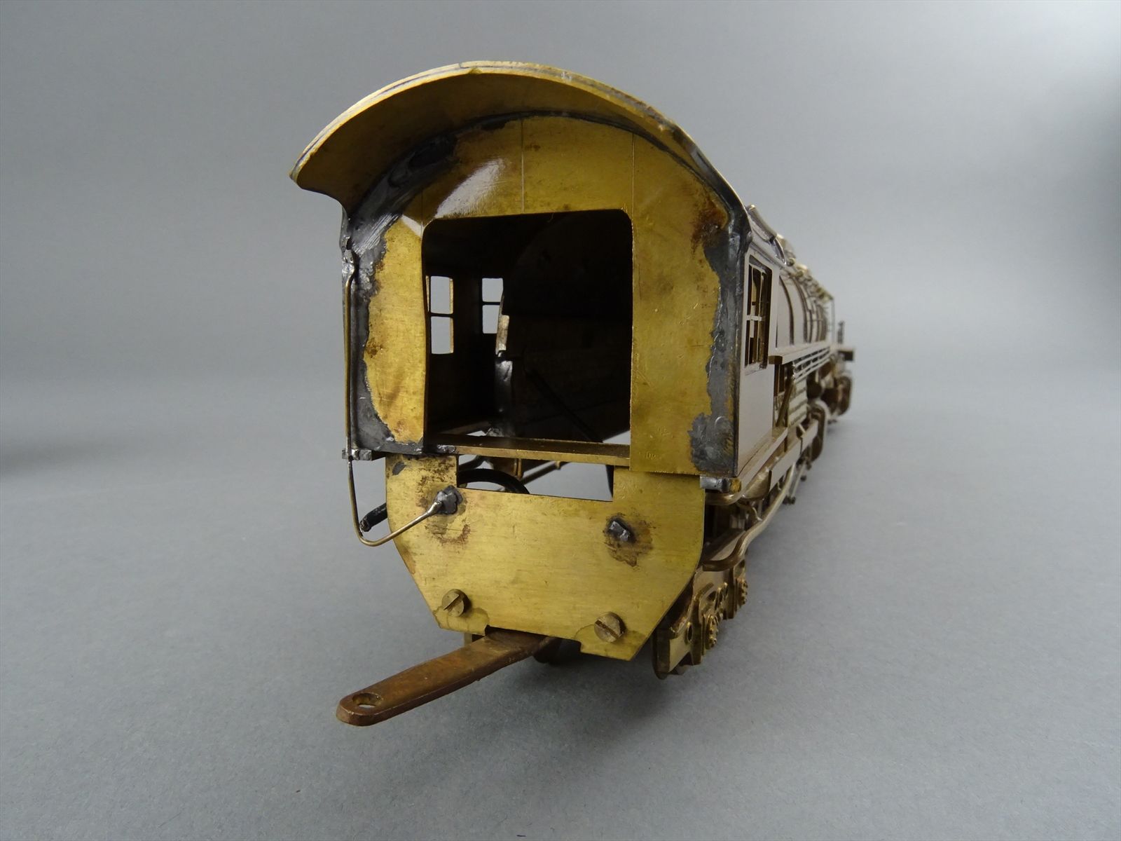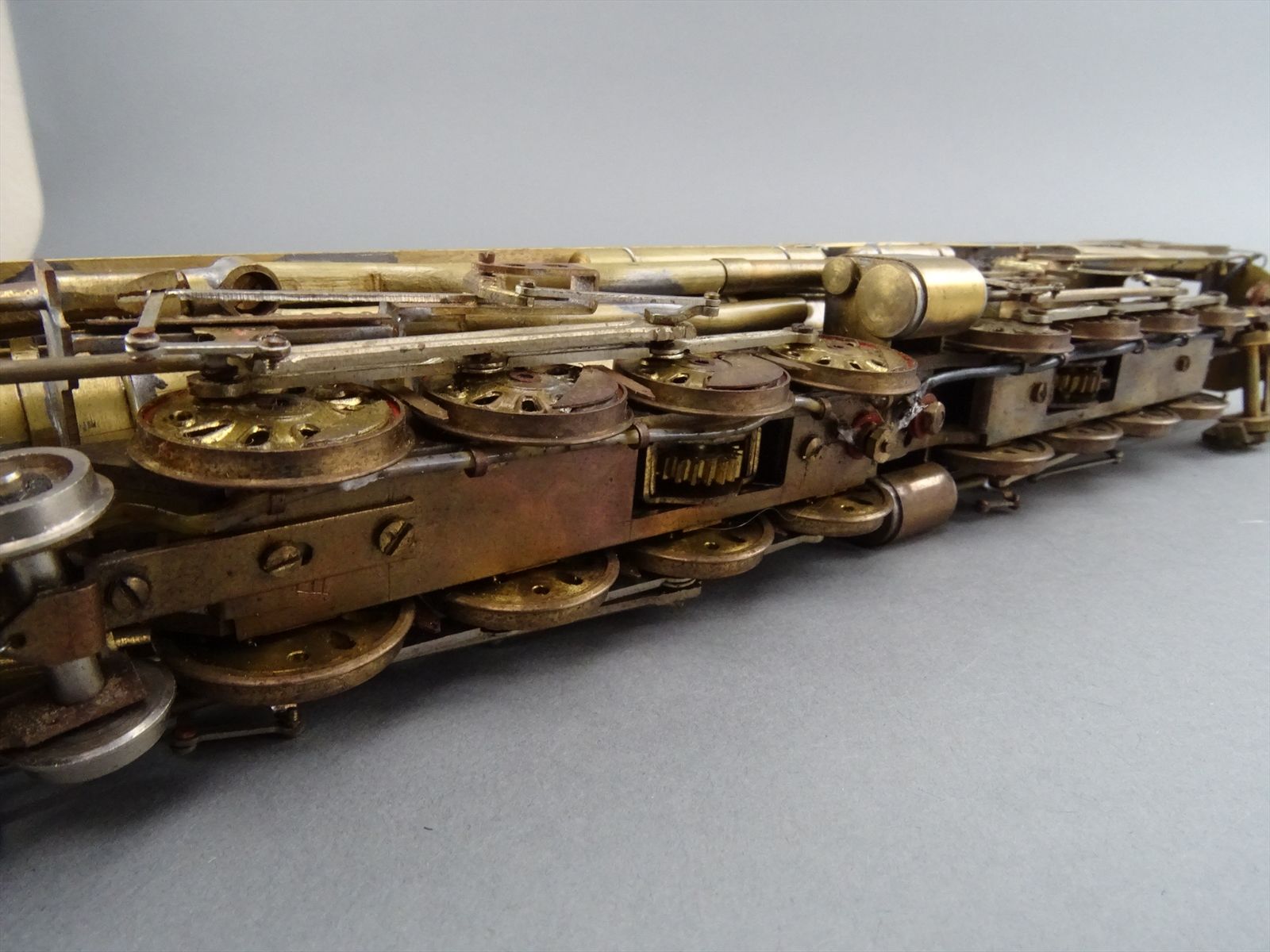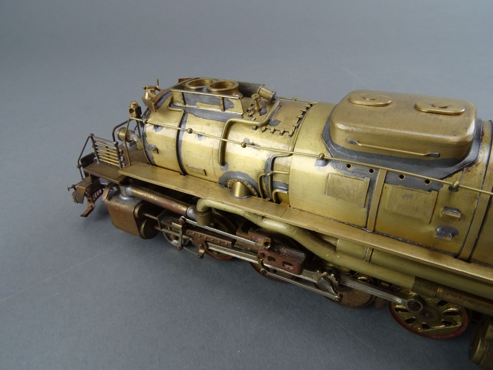 These early models were built entirely from photographs. Yet most were scaled quite accurately, albeit lacking the "fine scale detailing" which today's modelers have come to expect. Notice this Big Boy has only two hatch covers atop the Big Boy's sand domes. This was because the builder only had SIDE VIEW photos to work from! How could he have known the hatch covers were in pairs. Also the tender truck pedestal side-frames are 'hollowed out' and made of copper. The builder would make a single side frame pattern. This would be pressed into a substance like our modeling clay which was then painted with an electrically conductive paint, placed in a plating tank, and plated with copper. Thus the nicely detailed replica of the original was made, some time before the 'Lost Wax' process began to be employed. Later hand built Big Boys did not use this process.Every axle on both the loco and tender is sprung. A lot of extra handwork for sure, and process that did not last long because of all the work. Steel dies were created which allowed some of the parts to be 'coined'. However, because of the prohibitively expensive cost of the dies, they were used only for parts that could be used on many models. This model has coined driver centers, but only one style. Added to those are hand filed counterweights.