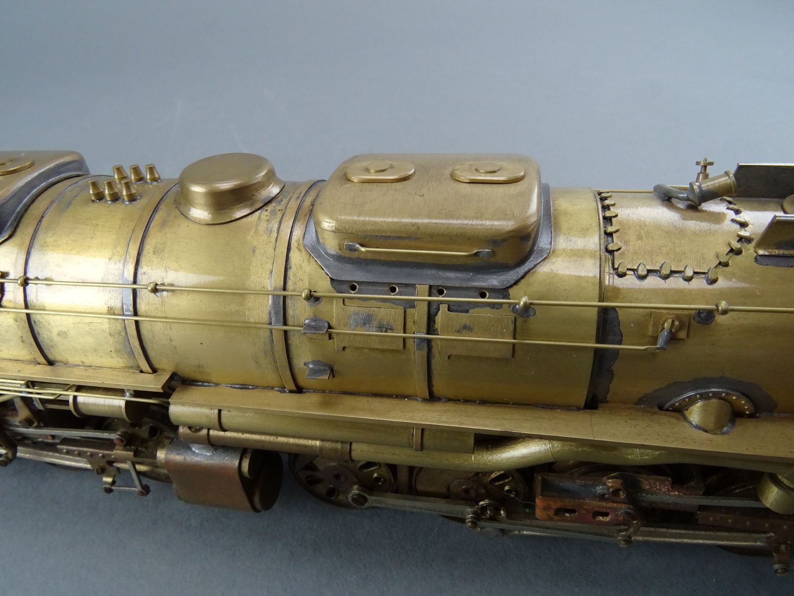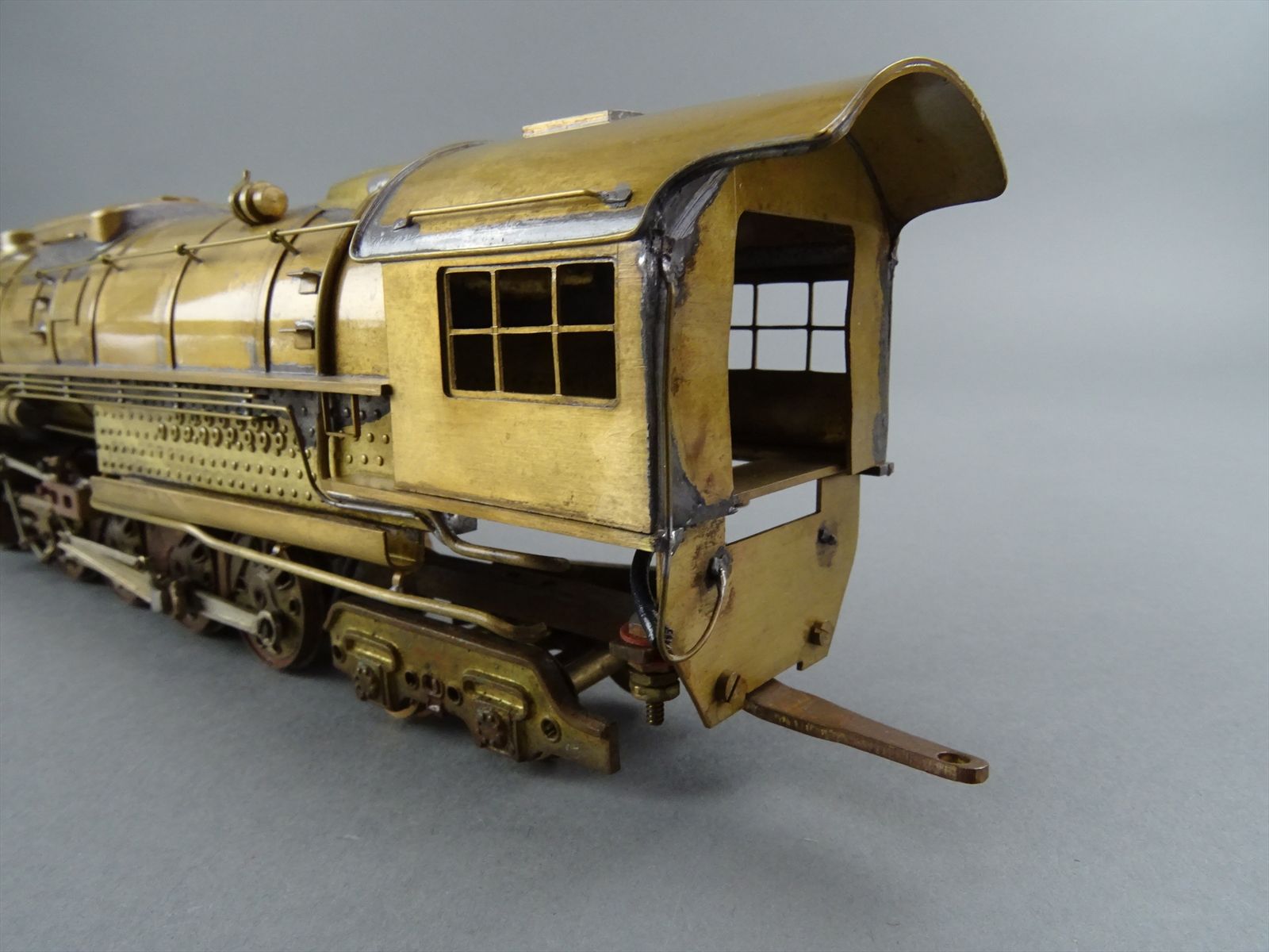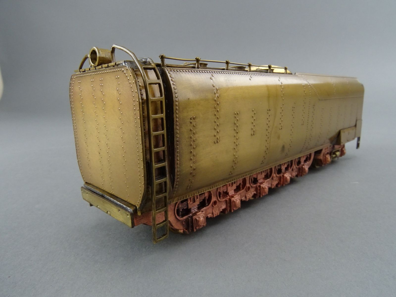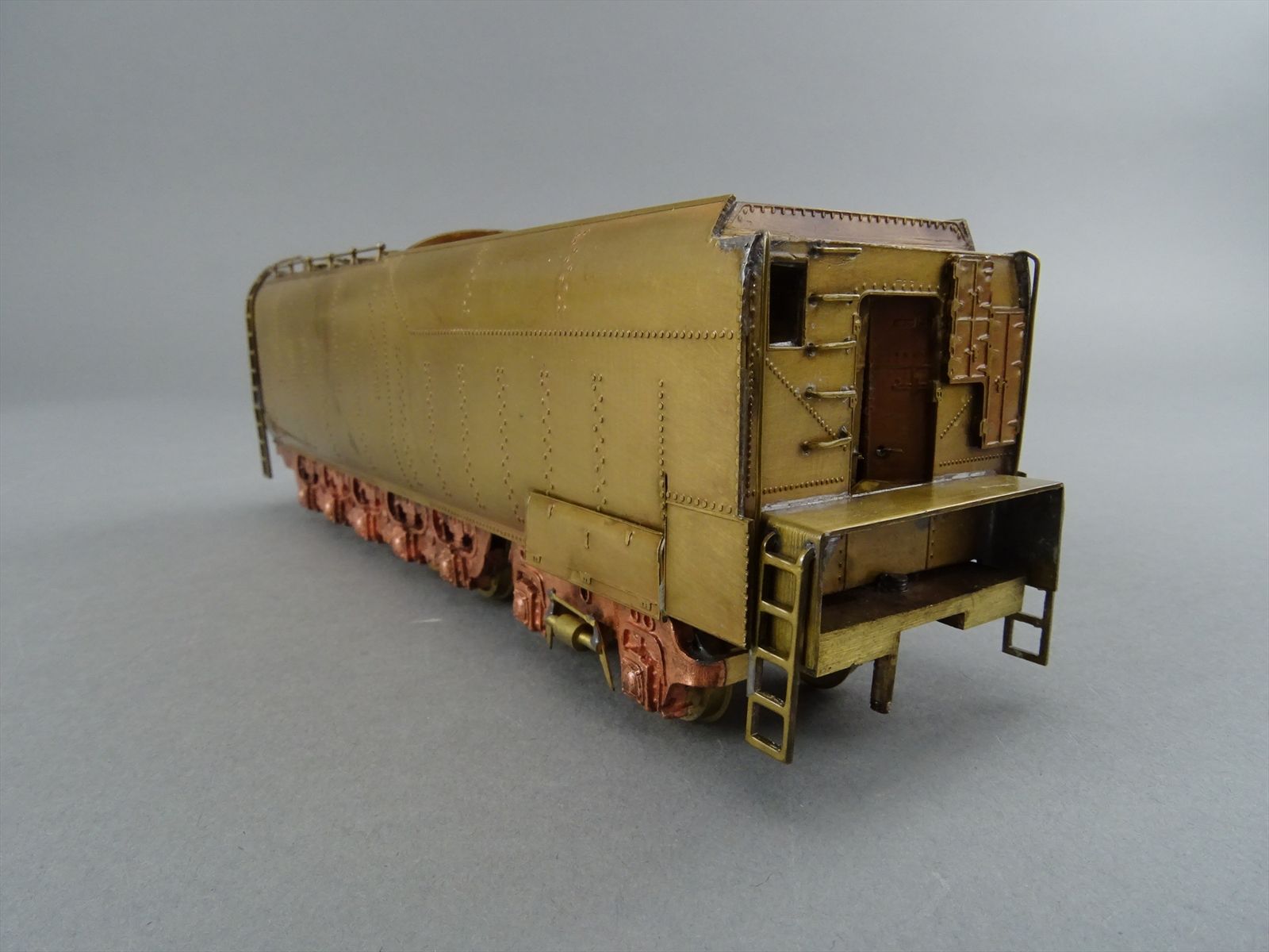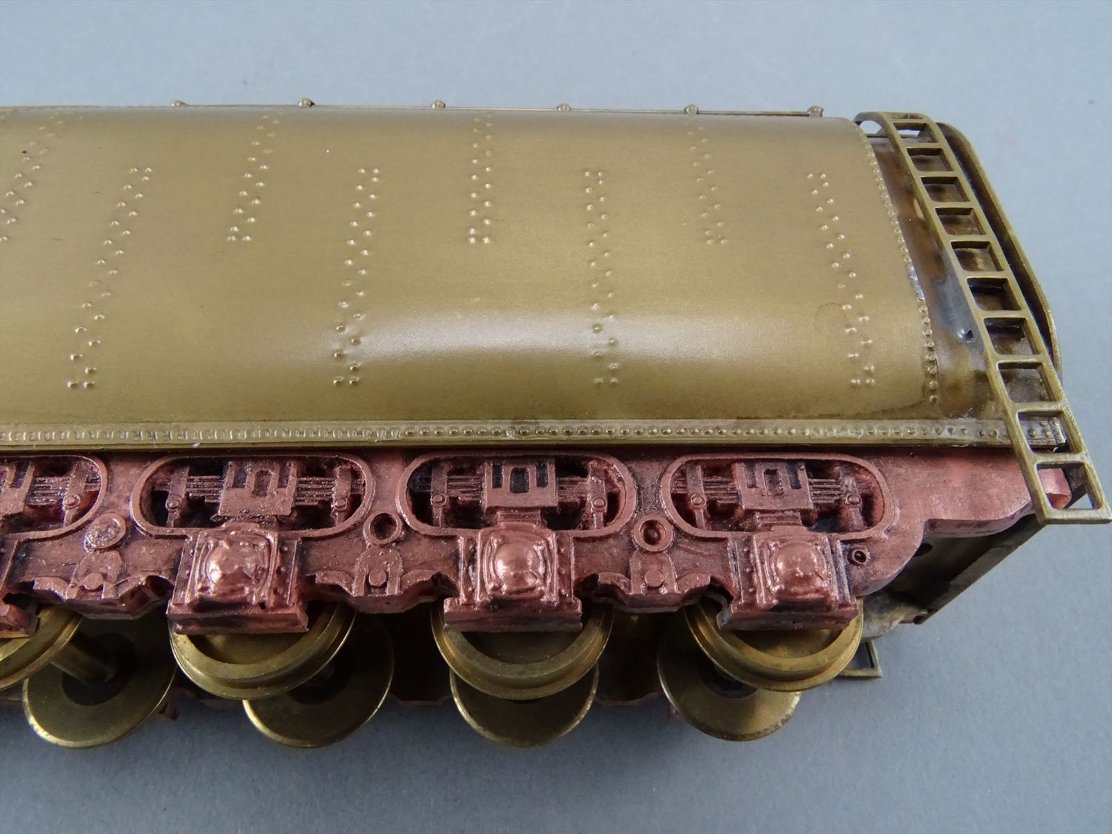 These early models were built entirely from photographs. Yet most were scaled quite accurately, albeit lacking the "fine scale detailing" which today's modelers have come to expect. Notice this Big Boy has only two hatch covers atop the Big Boy's sand domes. This was because the builder only had SIDE VIEW photos to work from! How could he have known the hatch covers were in pairs. Also the tender truck pedestal side-frames are 'hollowed out' and made of copper. The builder would make a single side frame pattern. This would be pressed into a substance like our modeling clay which was then painted with an electrically conductive paint, placed in a plating tank, and plated with copper. Thus the nicely detailed replica of the original was made, some time before the 'Lost Wax' process began to be employed. Later hand built Big Boys did not use this process.Every axle on both the loco and tender is sprung. A lot of extra handwork for sure, and process that did not last long because of all the work. Steel dies were created which allowed some of the parts to be 'coined'. However, because of the prohibitively expensive cost of the dies, they were used only for parts that could be used on many models. This model has coined driver centers, but only one style. Added to those are hand filed counterweights.