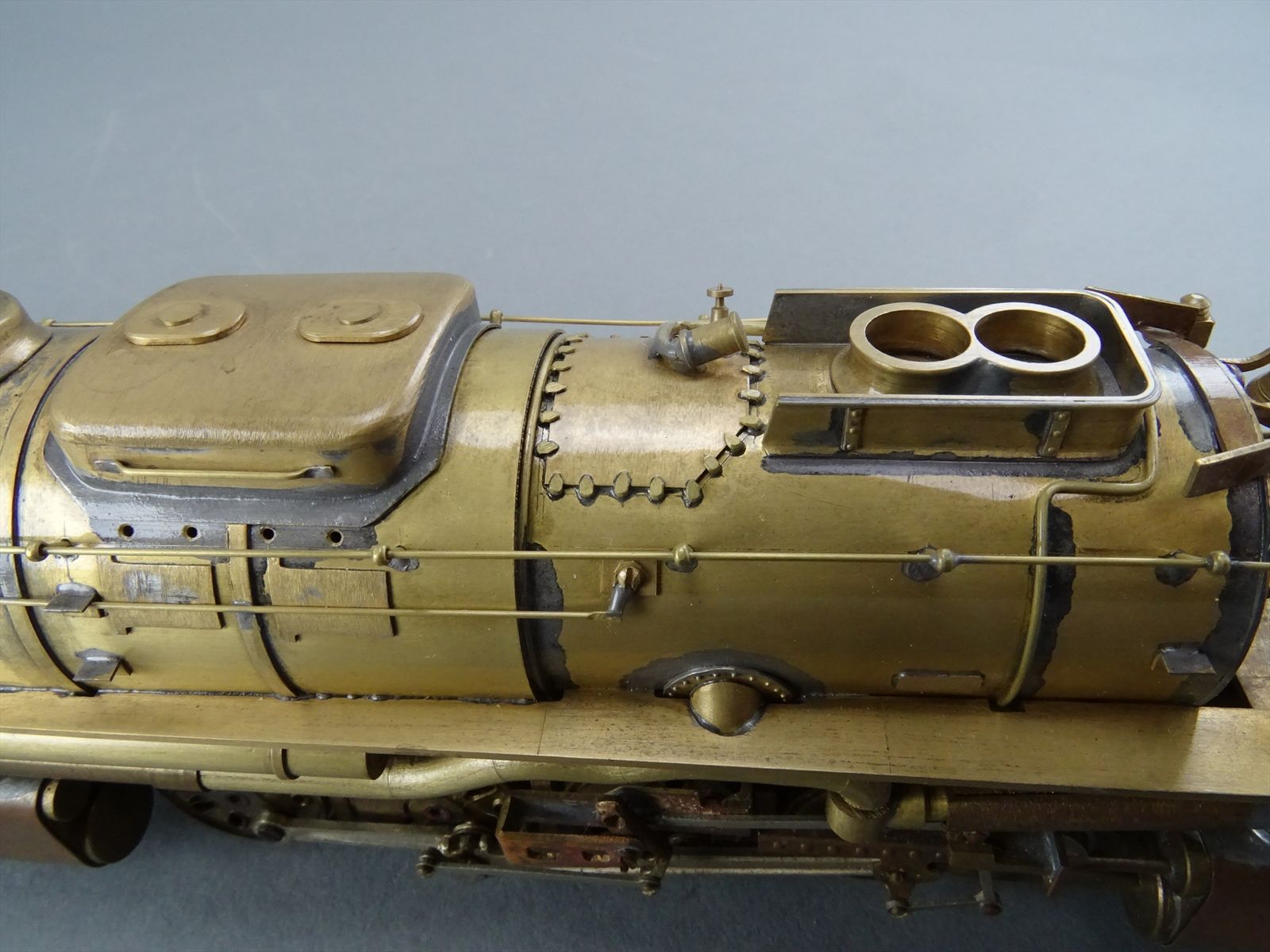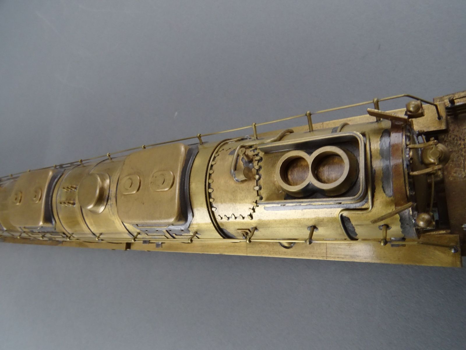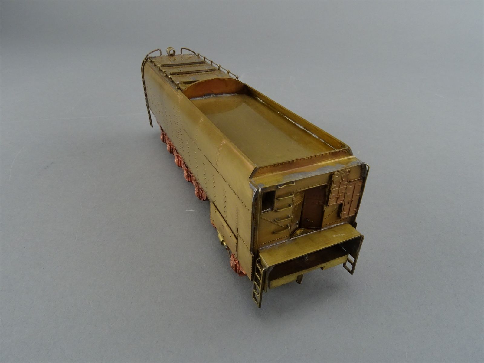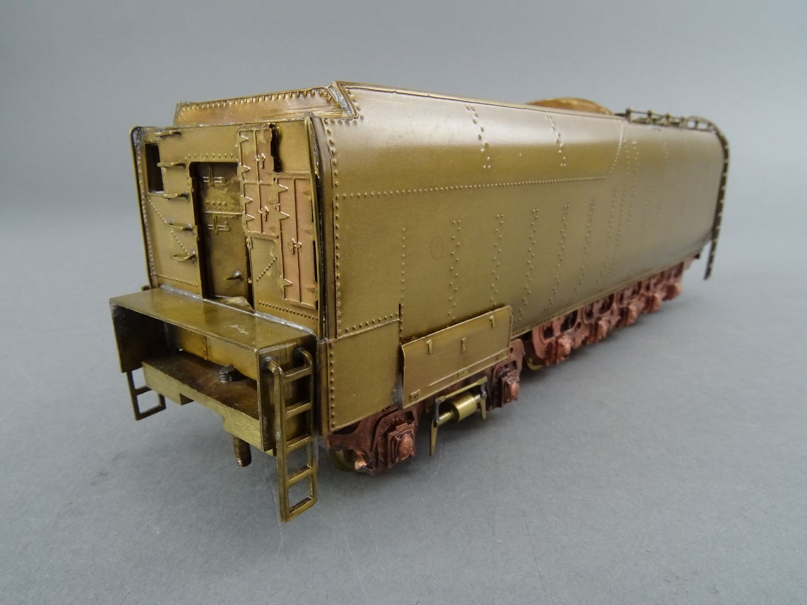 These early models were built entirely from photographs. Yet most were scaled quite accurately, albeit lacking the "fine scale detailing" which today's modelers have come to expect. Notice this Big Boy has only two hatch covers atop the Big Boy's sand domes. This was because the builder only had SIDE VIEW photos to work from! How could he have known the hatch covers were in pairs. Also the tender truck pedestal side-frames are 'hollowed out' and made of copper. The builder would make a single side frame pattern. This would be pressed into a substance like our modeling clay which was then painted with an electrically conductive paint, placed in a plating tank, and plated with copper. Thus the nicely detailed replica of the original was made, some time before the 'Lost Wax' process began to be employed. Later hand built Big Boys did not use this process.Every axle on both the loco and tender is sprung. A lot of extra handwork for sure, and process that did not last long because of all the work. Steel dies were created which allowed some of the parts to be 'coined'. However, because of the prohibitively expensive cost of the dies, they were used only for parts that could be used on many models. This model has coined driver centers, but only one style. Added to those are hand filed counterweights.