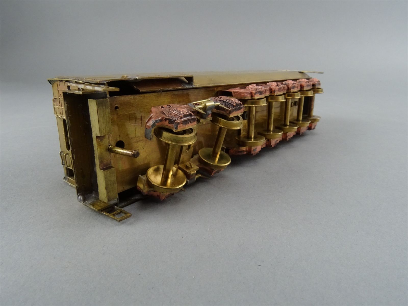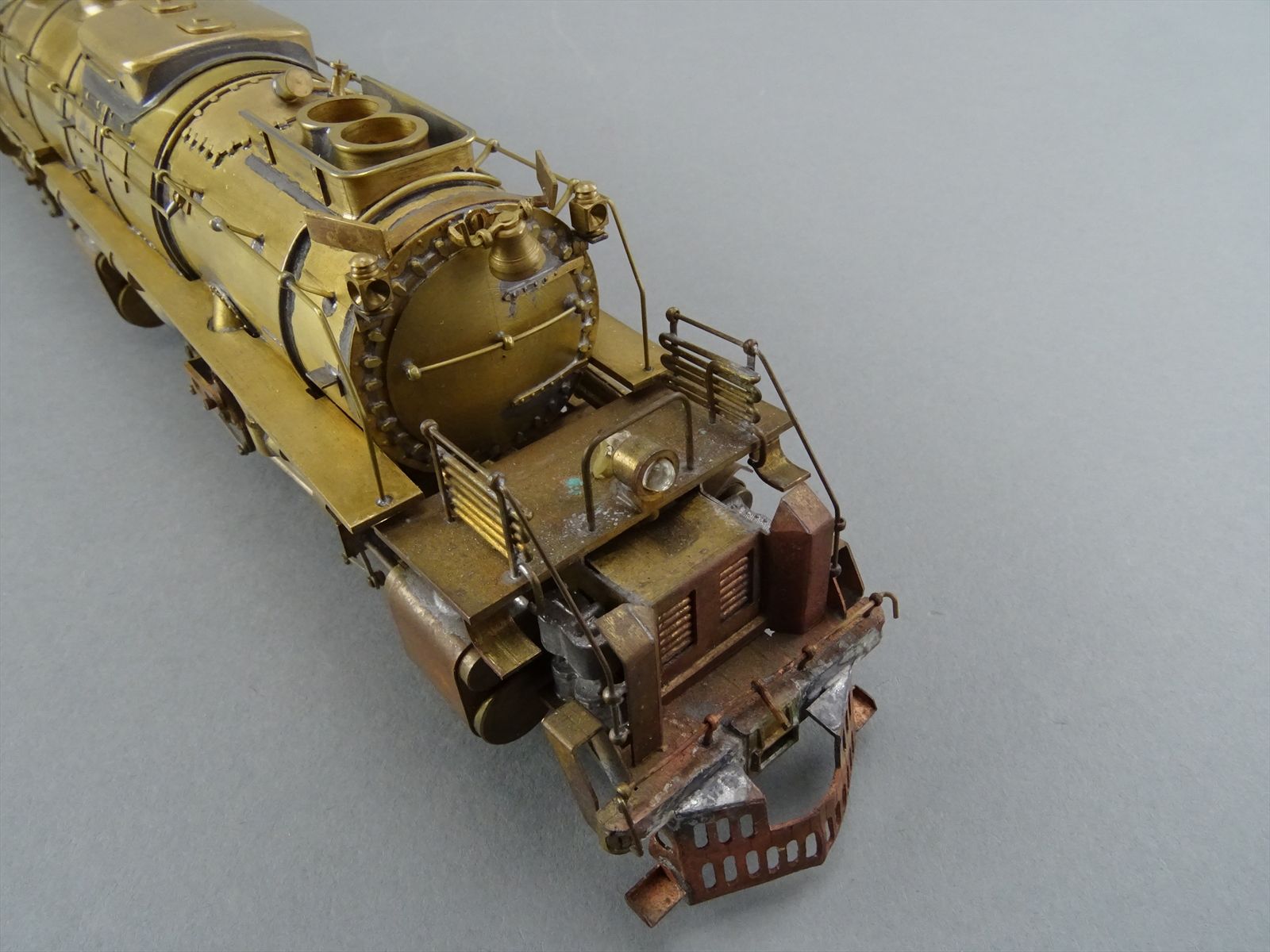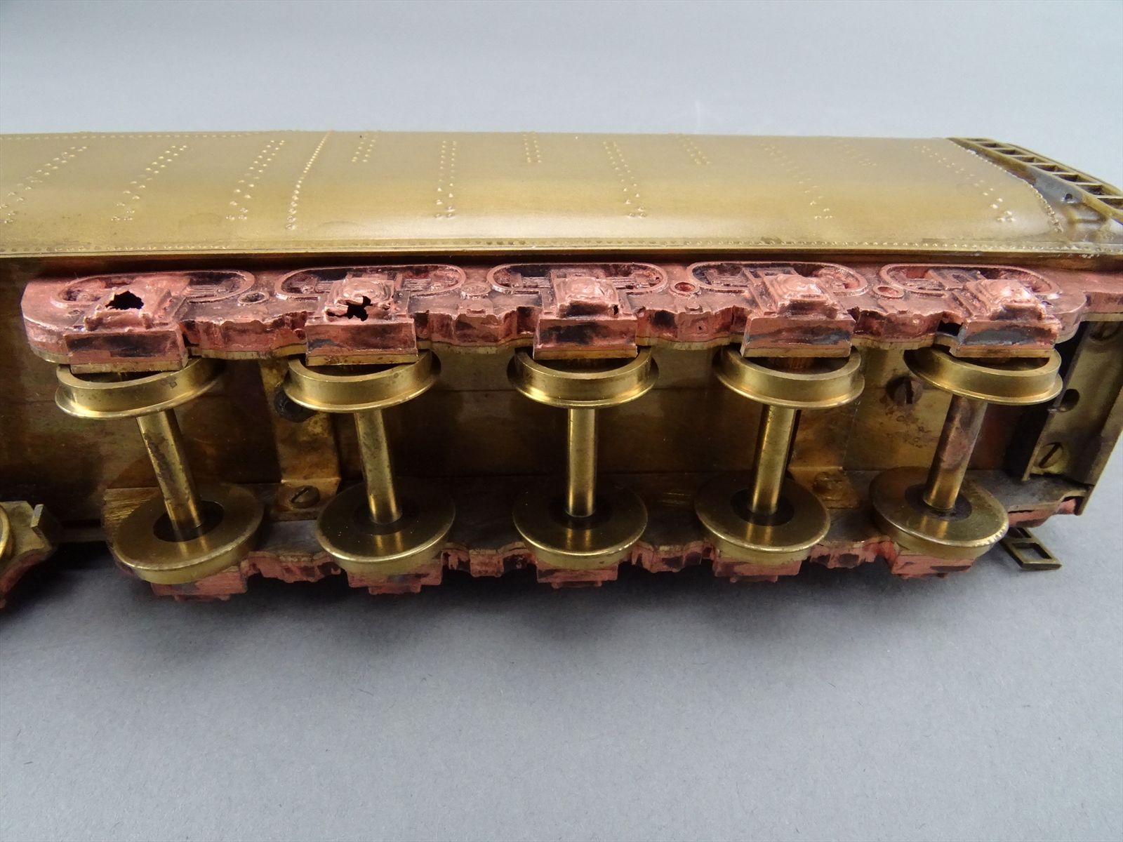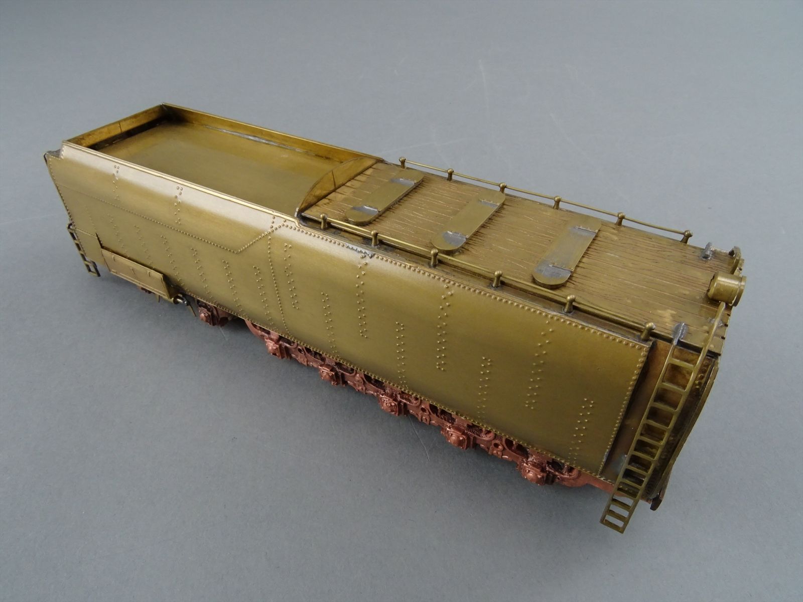 These early models were built entirely from photographs. Yet most were scaled quite accurately, albeit lacking the "fine scale detailing" which today's modelers have come to expect. Notice this Big Boy has only two hatch covers atop the Big Boy's sand domes. This was because the builder only had SIDE VIEW photos to work from! How could he have known the hatch covers were in pairs. Also the tender truck pedestal side-frames are 'hollowed out' and made of copper. The builder would make a single side frame pattern. This would be pressed into a substance like our modeling clay which was then painted with an electrically conductive paint, placed in a plating tank, and plated with copper. Thus the nicely detailed replica of the original was made, some time before the 'Lost Wax' process began to be employed. Later hand built Big Boys did not use this process.Every axle on both the loco and tender is sprung. A lot of extra handwork for sure, and process that did not last long because of all the work. Steel dies were created which allowed some of the parts to be 'coined'. However, because of the prohibitively expensive cost of the dies, they were used only for parts that could be used on many models. This model has coined driver centers, but only one style. Added to those are hand filed counterweights.