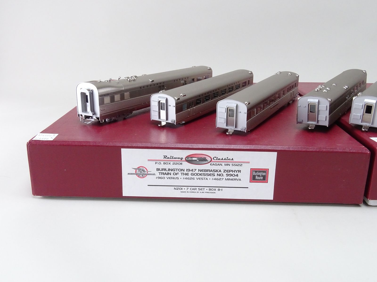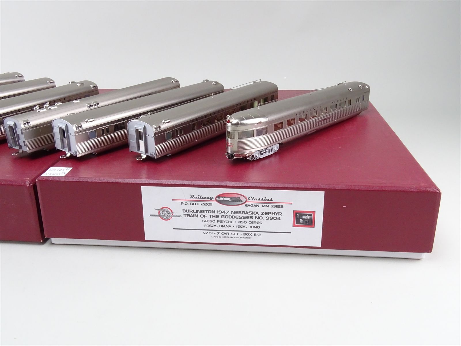 HO Brass Model - RWC NZ01 NZ Nebraska Zephyr 1947 Burlington Train of the Goddesses #9904 7 Car Set B-1 + B-2 - F/P + Interior - Ajin