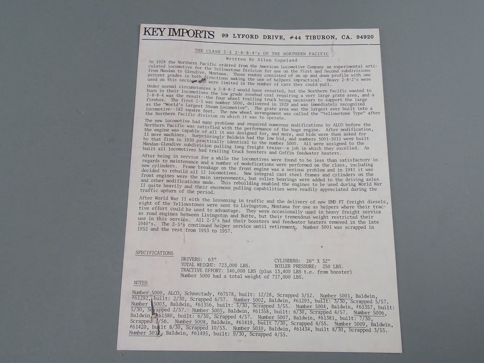 HO Brass Model - Key NP Northern Pacific Z-5 2-8-8-4 1940's Version #5001 - Custom + Weathered - 1982 Run - Samhongsa