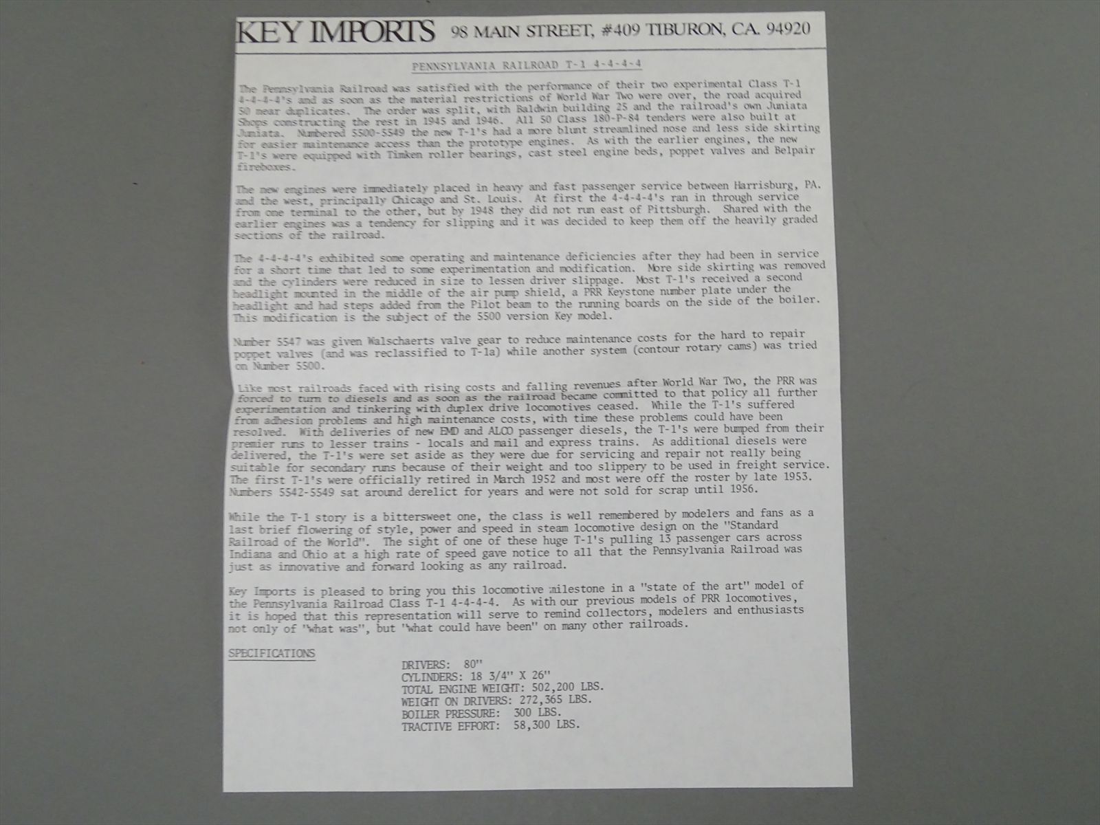 HO Brass Model - Key CS#54 PRR Pennsylvania T-1 Duplex #6111 - F/P - Samhongsa - HARD TO FIND!