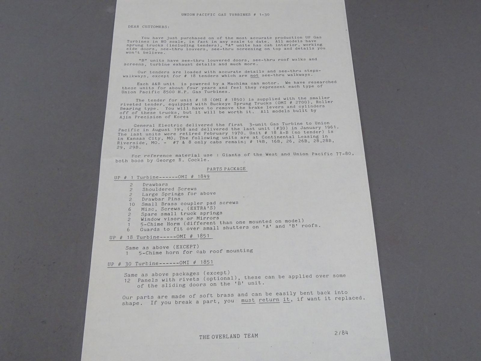 HO Brass Model - OMI 1850 UP Union Pacific 8500HP 3 Unit Gas Turbine #18 - Pro Paint - 1984 Run - Ajin
