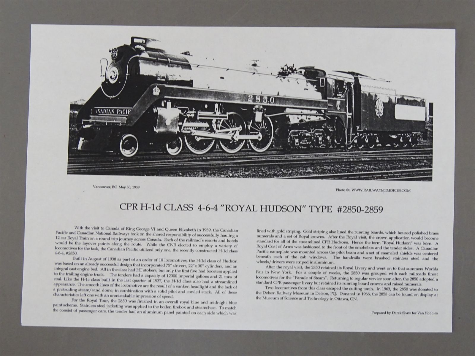 HO Brass Model - VH CP CPR Canadian Pacific H1D Royal Hudson 4-6-4 #2852 - F/P - Coasting Drive - 1992 Run - Samhongsa