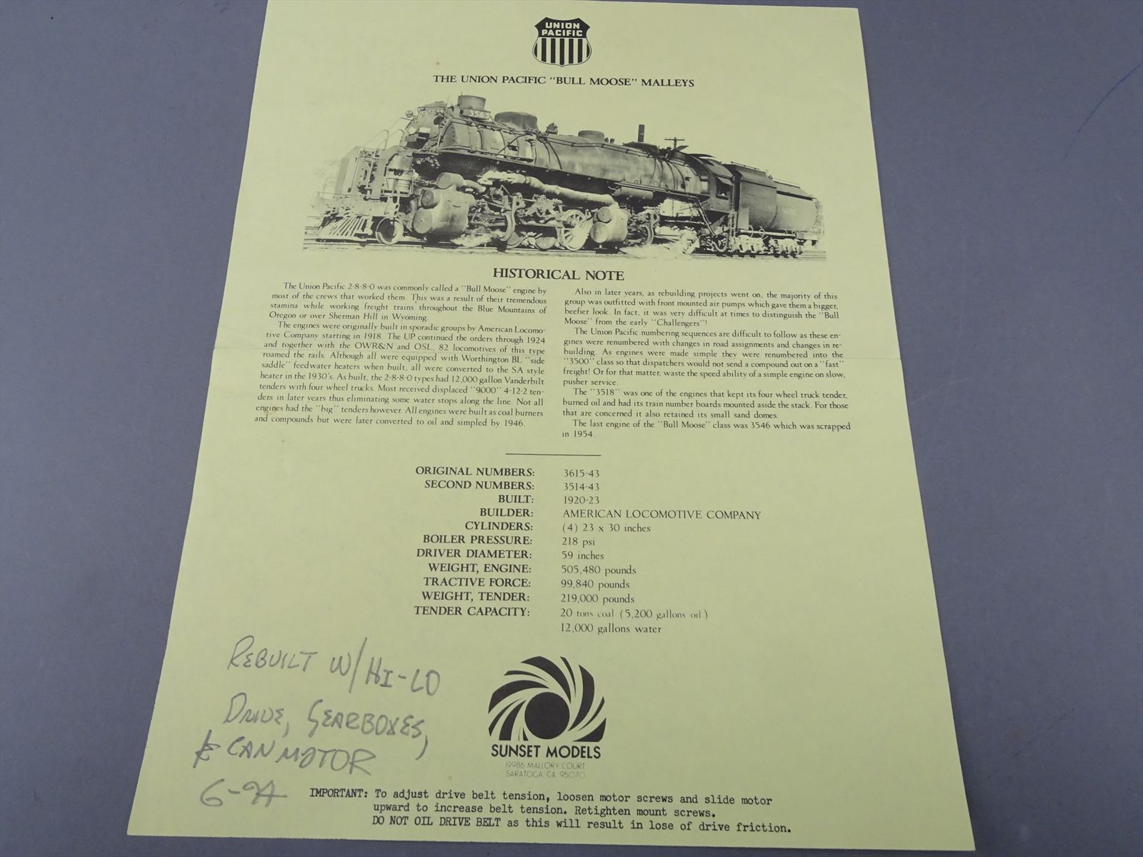 HO Brass Model - Sunset UP Union Pacific Bull Moose 2-8-8-0 #3518 - Custom - 1984 Run - Samhongsa