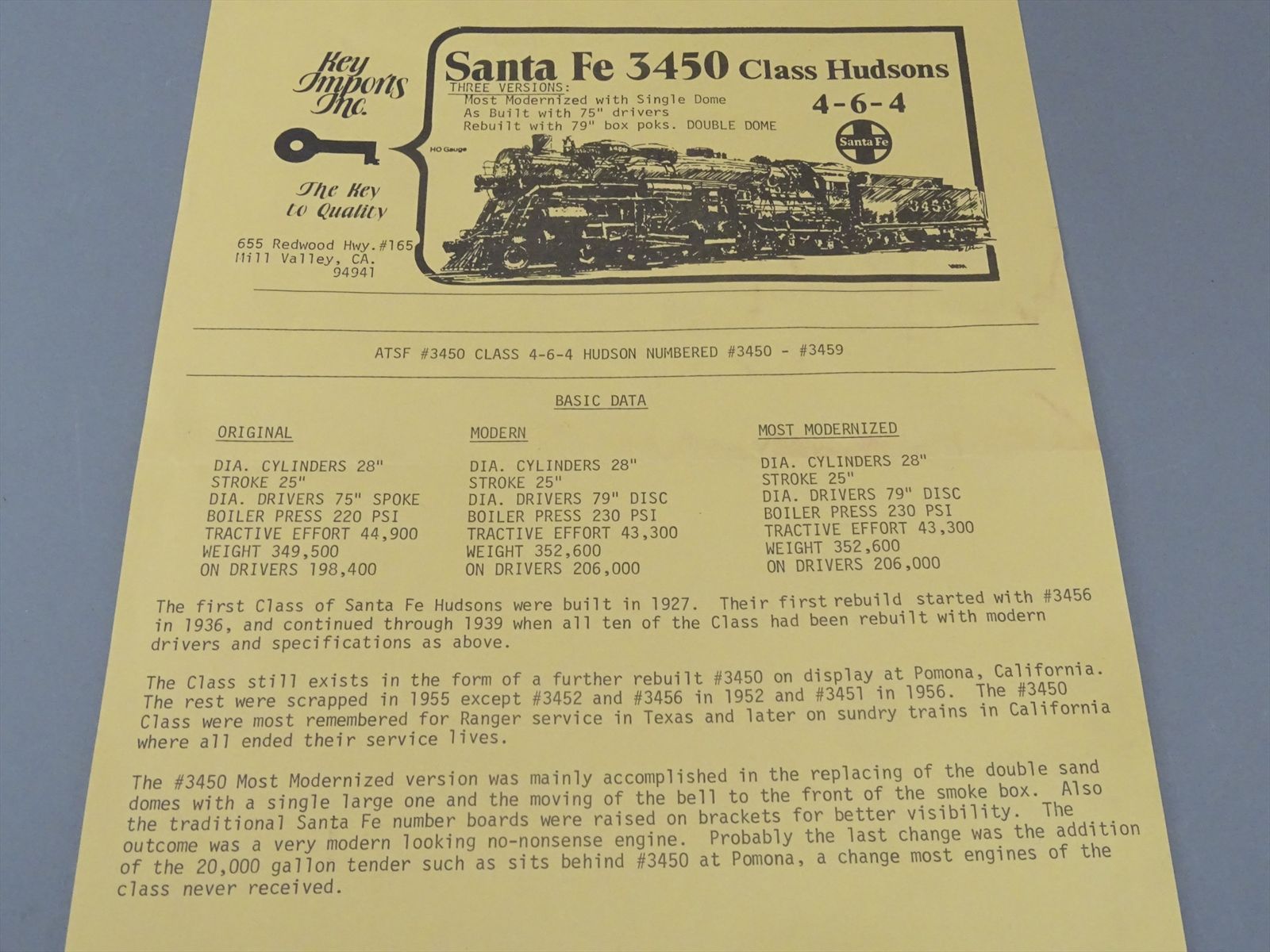HO Brass Model - Key AT&SF Santa Fe 4-6-4 Most Modernized #3450 - Custom - 1977 Run - Samhongsa