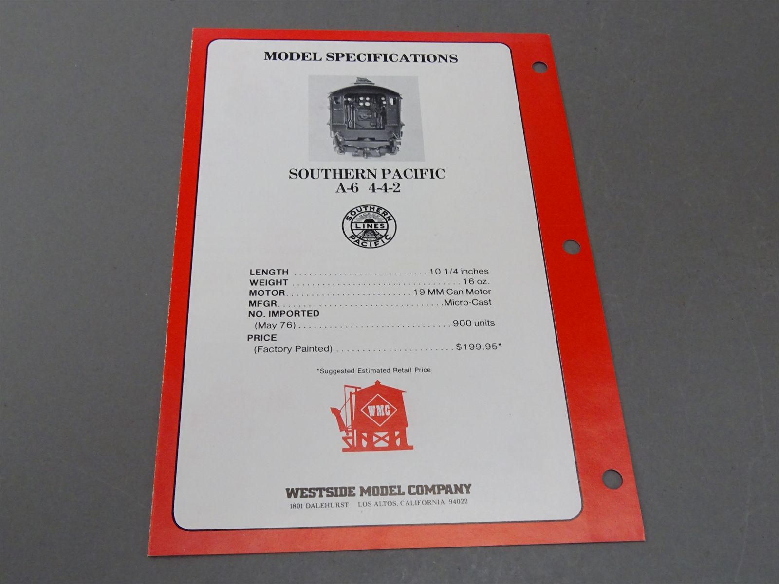 HO Brass Model - WMC SP Southern Pacific A-6 4-4-2 Partial Daylight Atlantic #3000 - F/P - 1976 Run - Mizuno