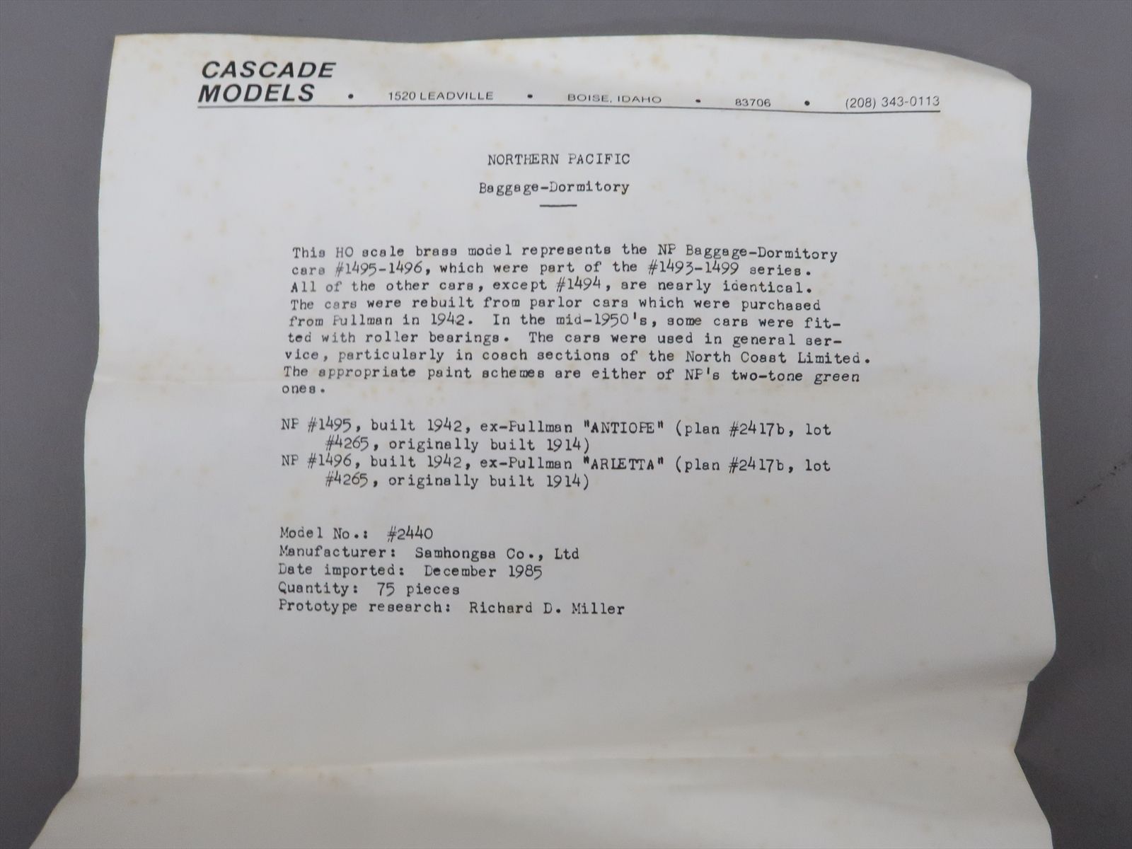 HO Brass Model - Cascade 2440 NP Northern Pacific Baggage Dormitory #1495-1496 - Unpainted - 1985 Run - Samhongsa