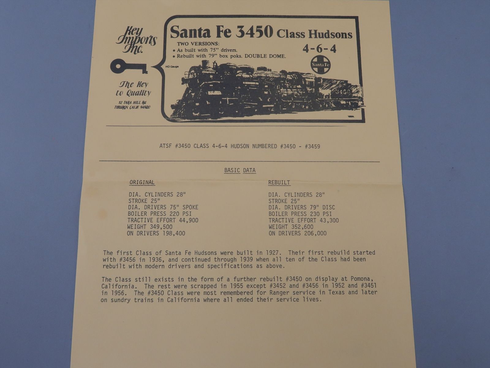 HO Brass Model - Key AT&SF Santa Fe 4-6-4 Modernized 3450 Class - Unpainted - 1977 Run - Samhongsa