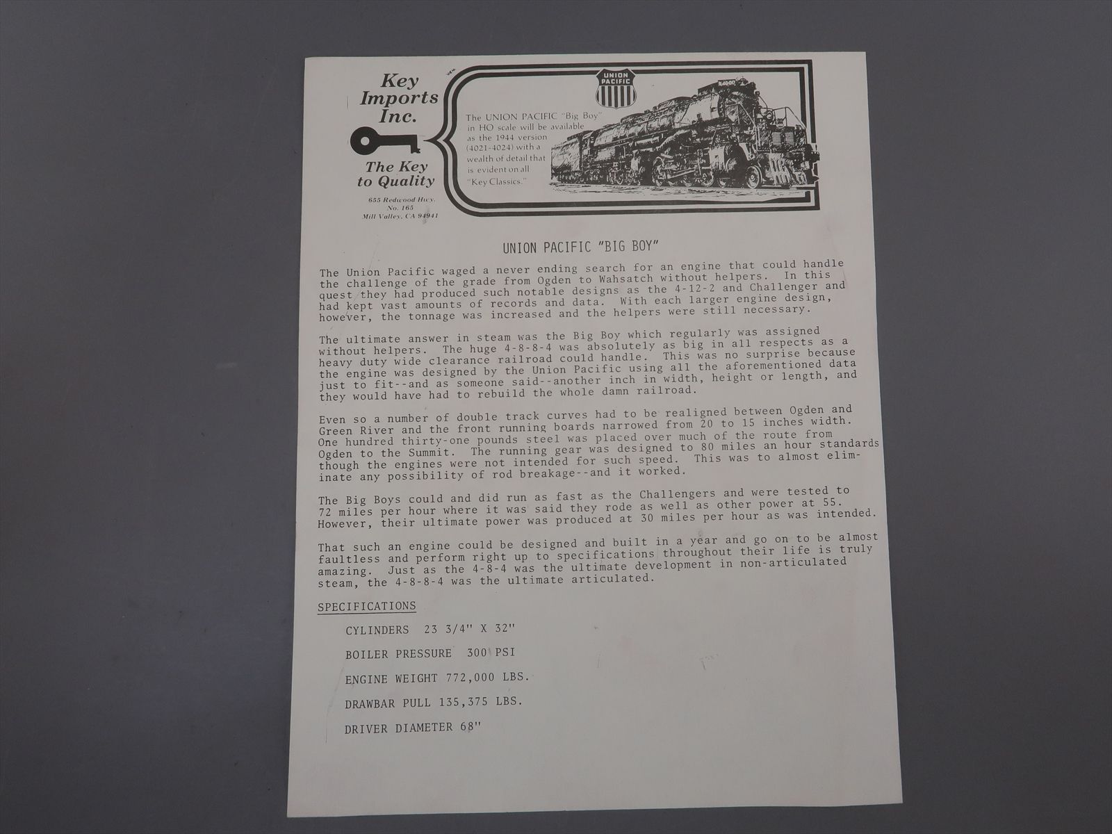 HO Brass Model - Key UP Union Pacific Big Boy 4-8-8-4 #4020 - Custom + Unlttered - 1981 Run - Samhongsa
