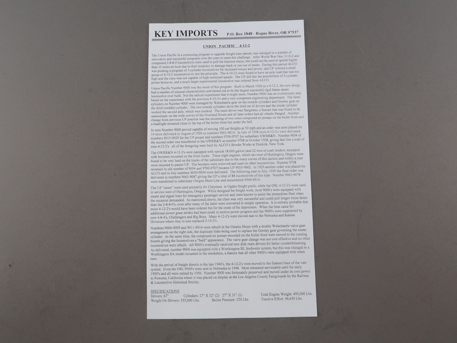HO Brass Model - Key UP Union Pacific 4-12-2 #9043 Standard Nines - F/P - 2004 Run - Made in Korea
