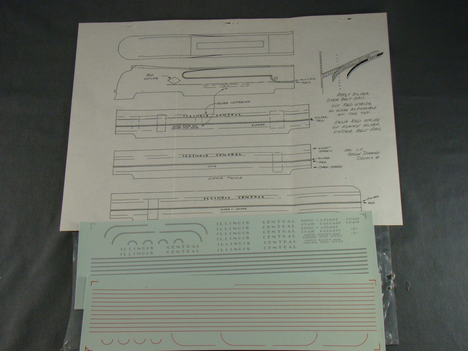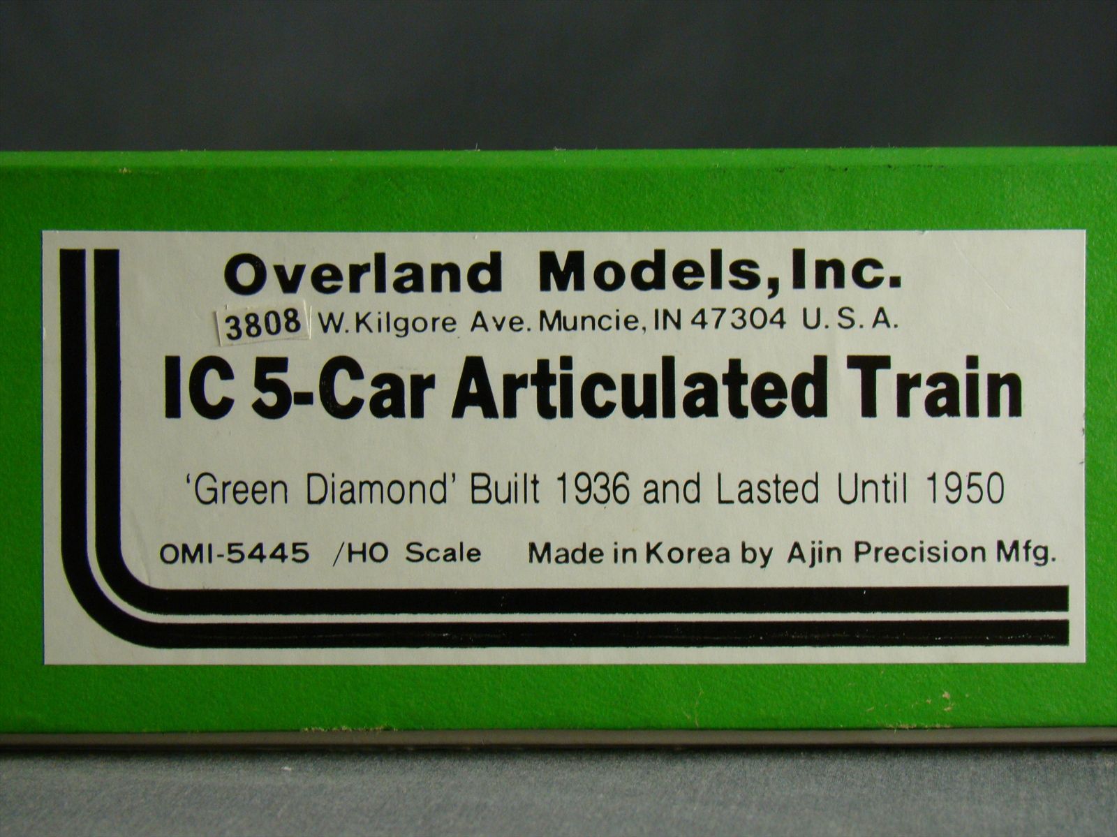 OMI #5445 IC, Illinois Central Articulated Train, Green Diamond, Built 1936 and lasted until 1950. Cars do not have interior detail. Model does have exceptional overall detail. Powered model. Test run only. Runs well. Hard to find model, great looking train! Note: Not many of these were imported unpainted, so it is a pretty rare model. Parts baggie includes the important plaques for the loco. Decal Set included