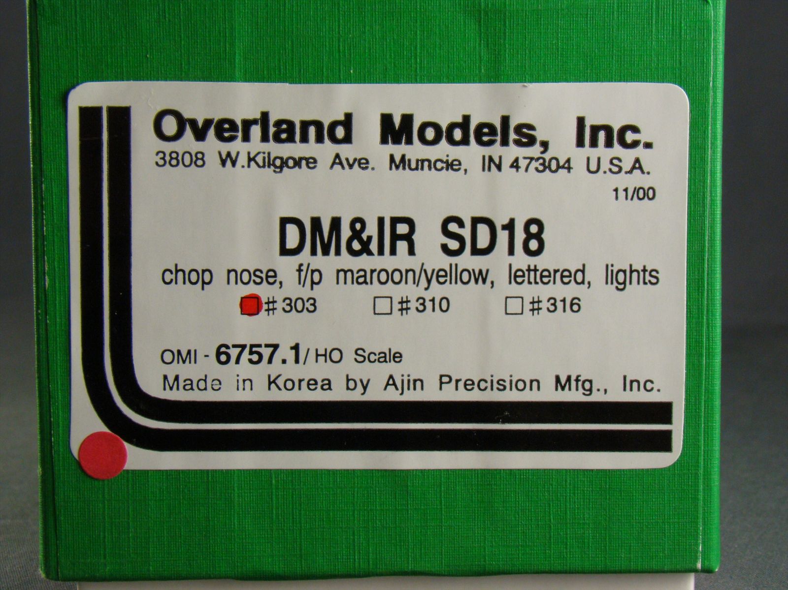 | Notes: | FACTORY PAINTED - CHOP NOSE - #303 OR 310 OR 316 - MAROON / YELLOW - LIGHTS - OMI-6757.1 - DULUTH MISSABE & IRON RANGE |
